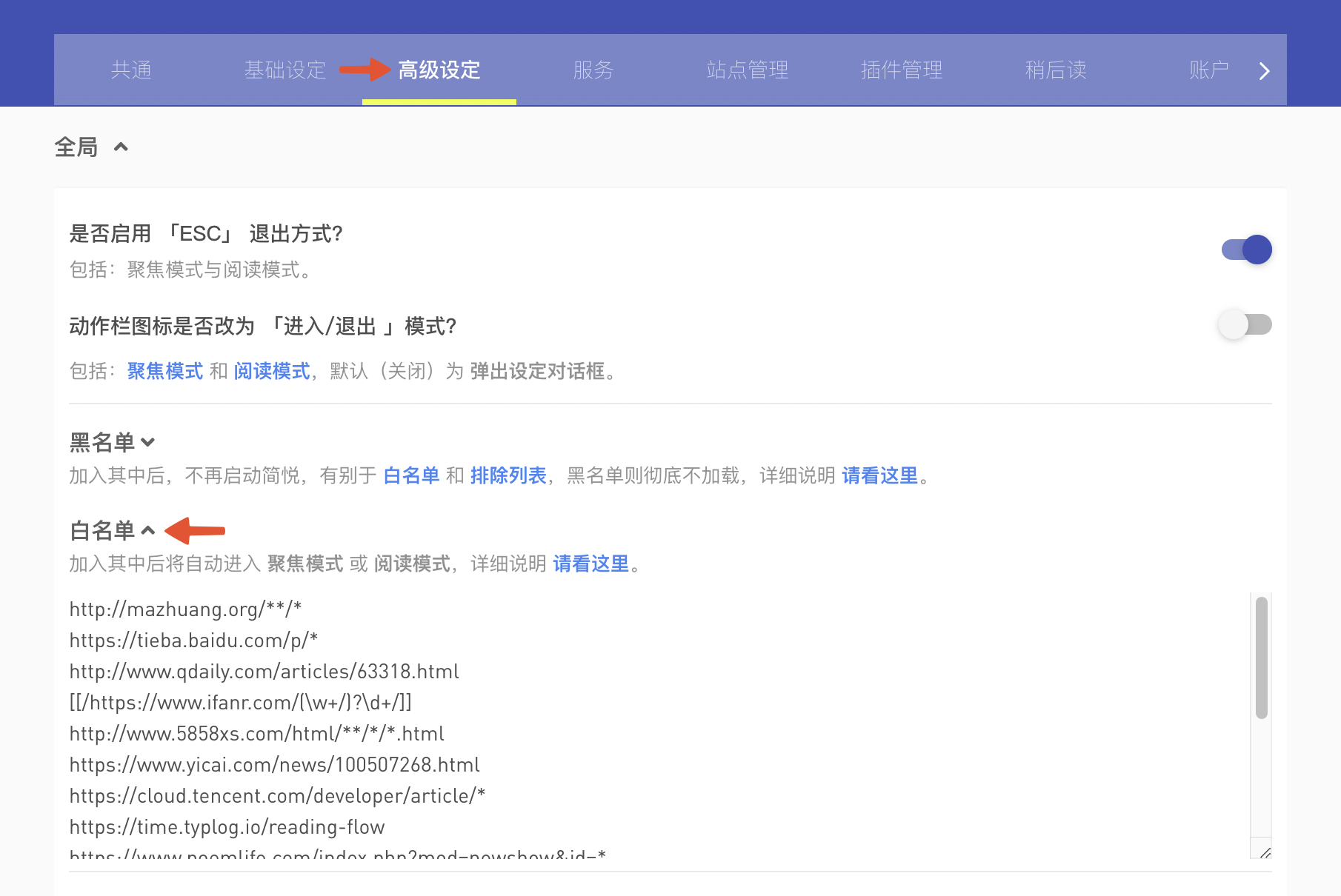 黑名单 相反,加入到列表中的 URL 将自动进入阅读模式。