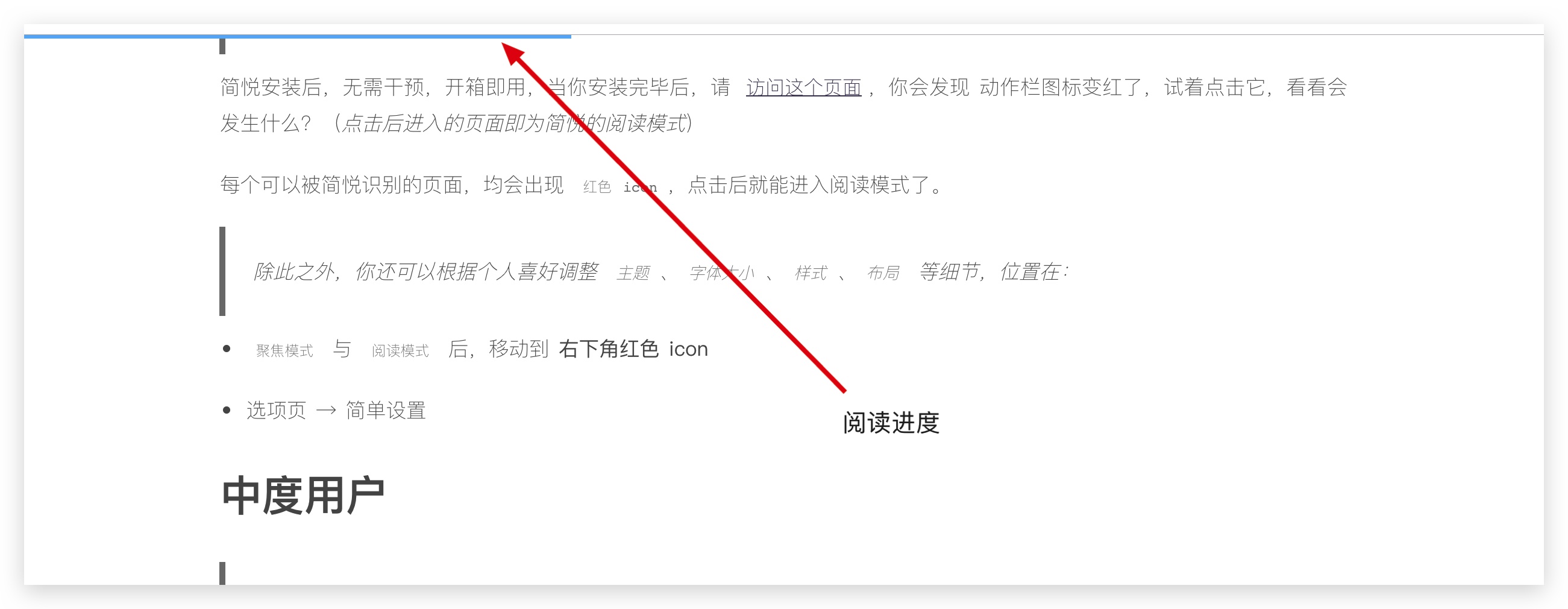 进入 阅读模式 后,会在页面的上方显示一个阅读进度。 Xnip2019-05-16_15-26-06.jpg