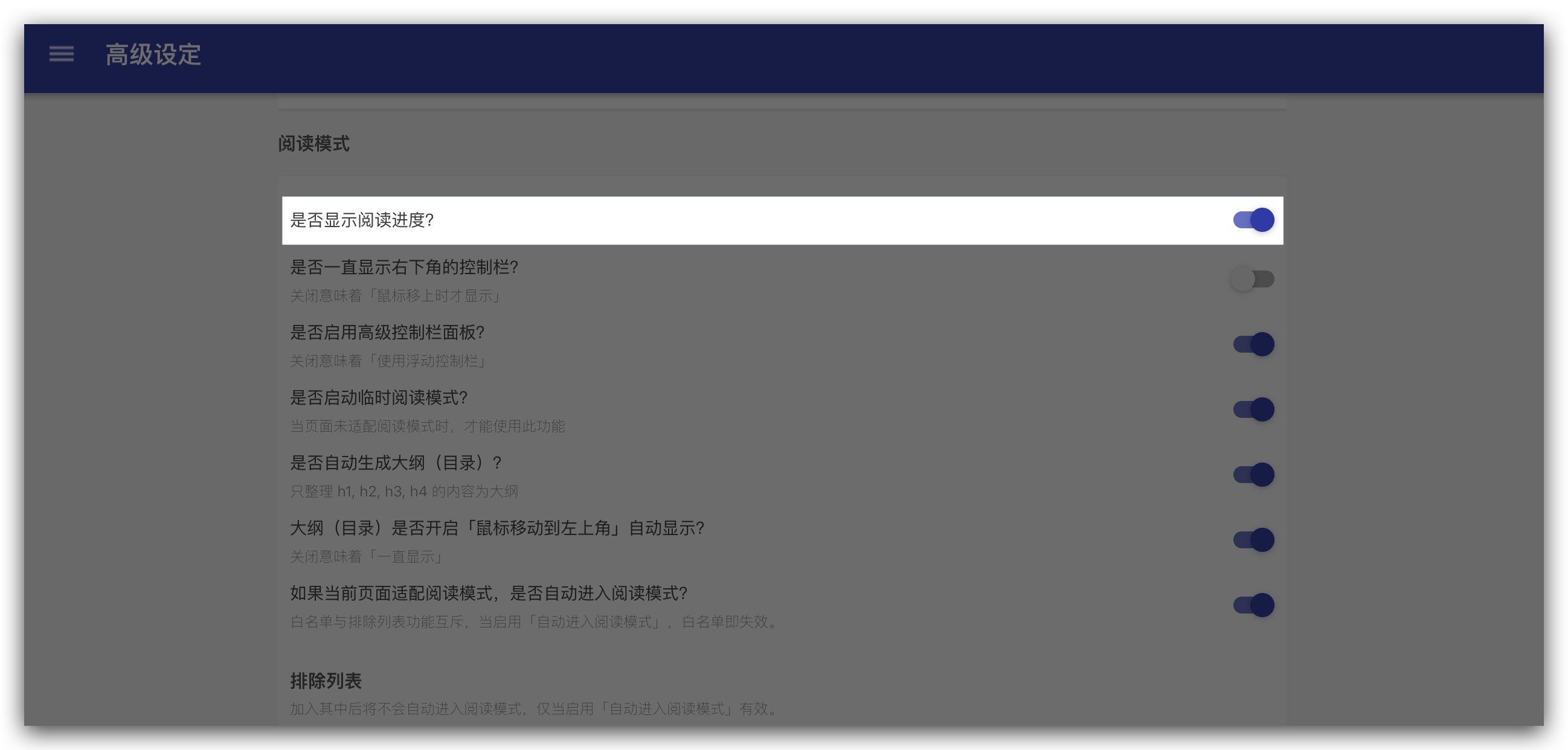 选项页 → 高级设定 → 阅读模式